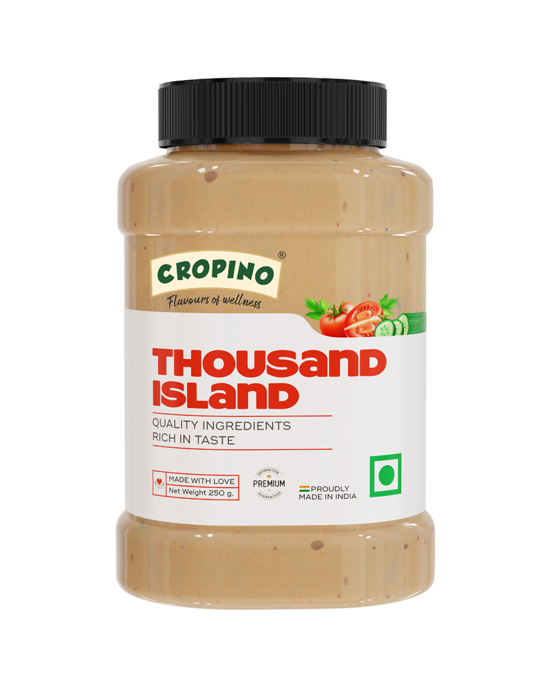 Cropino Thousand Island Dressing is a tangy, sweet, and zesty condiment that adds a rich, creamy flavor to a variety of dishes. Made with a base of mayonnaise and other ingredients like ketchup, vinegar, and spices, it is a versatile dressing perfect for both salads and sandwiches.